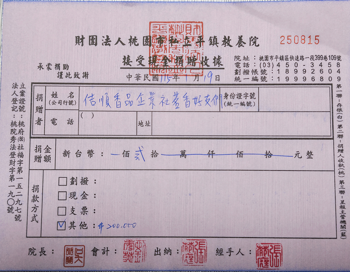 我自己個人再多捐104000元、金紙餘額款96000元,共計20萬元整,我準備把這筆錢捐到平鎮教養院,我們每一次報名參加煙供法會,可以幫助無形眾生早日解脫,又可讓自己消業增福,當然我們對社會上也盡一份小小的心力,大家都是一同再做財佈施,這些剩餘款項,錢財清清楚楚。